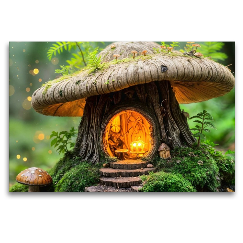 Tief im Wald, verborgen zwischen Moos und Pilzen, leuchtet ein kleines Feenhaus im Inneren eines geheimnisvollen Pilzes. Eine Szene voller Magie, die zum Entdecken einlädt. Das Motiv wurde mit moderner KI-Kunst gestaltet und entfaltet seine Wirkung sowohl als hochwertige HD-Leinwand als auch als faszinierendes Puzzle. Perfekt für alle, die märchenhafte Details lieben.